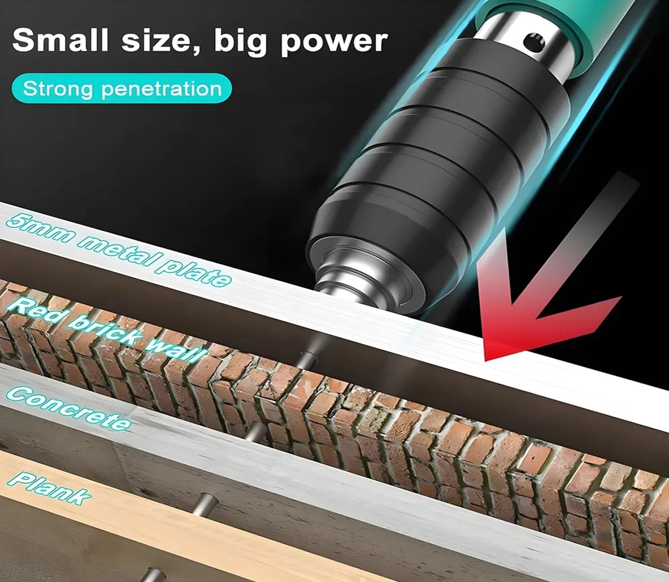 Adjustable power settings (3–4 speed/gear levels) let you fine-tune penetration for different substrates—from drywall and red brick to steel and concrete (capable of piercing 3 mm steel in just 0.1 seconds)